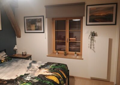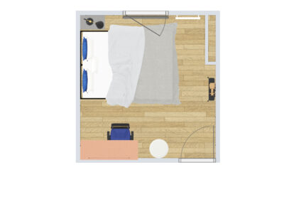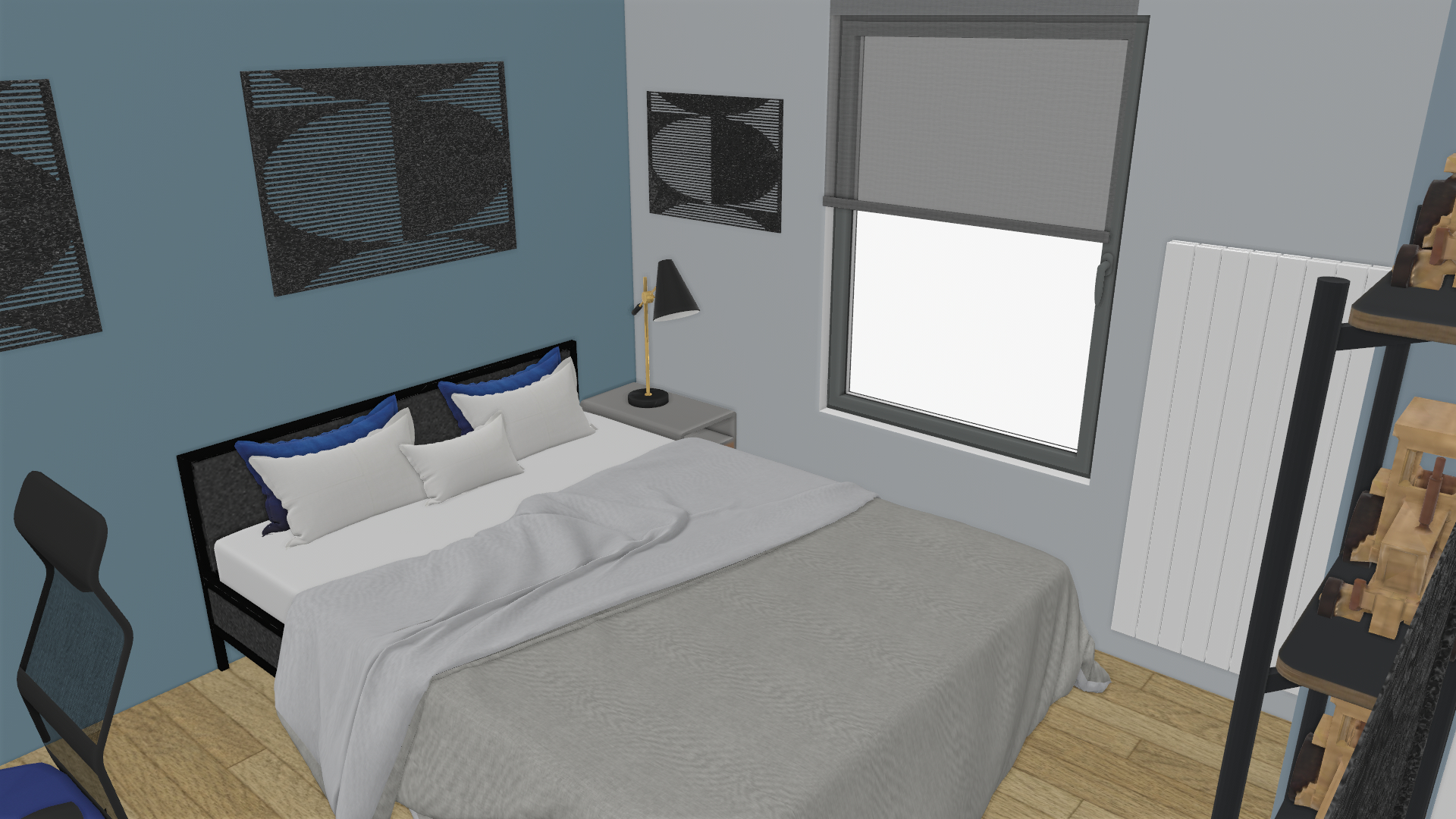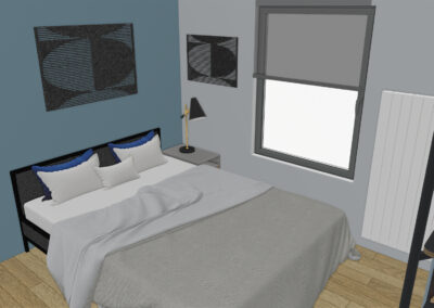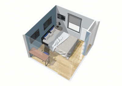 La chambre est équipée d’un grand lit double. Il faut réussir à aménager la pièce en prenant en compte ce couchage imposant, placer un bureau et une « vitrine » pour la collection de miniatures.