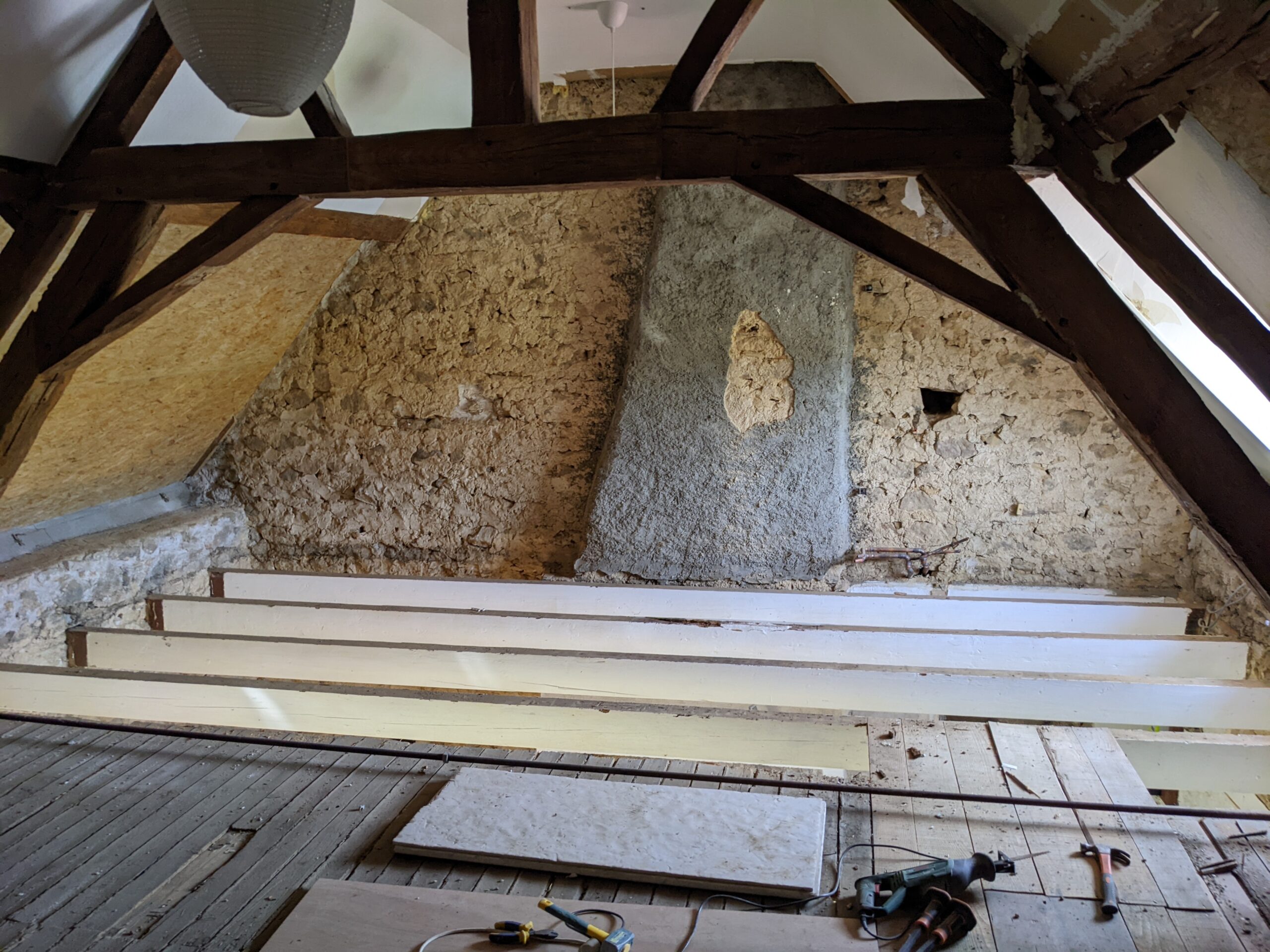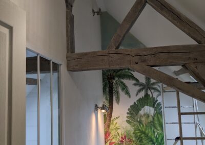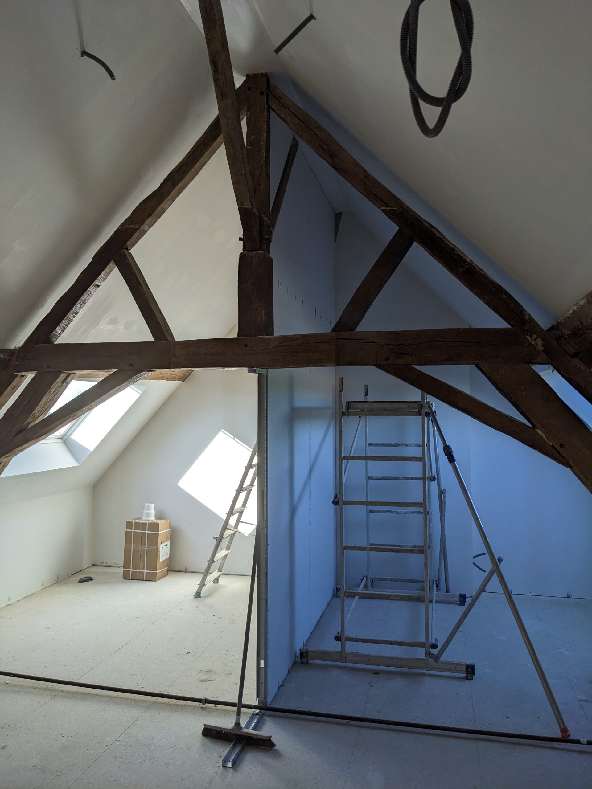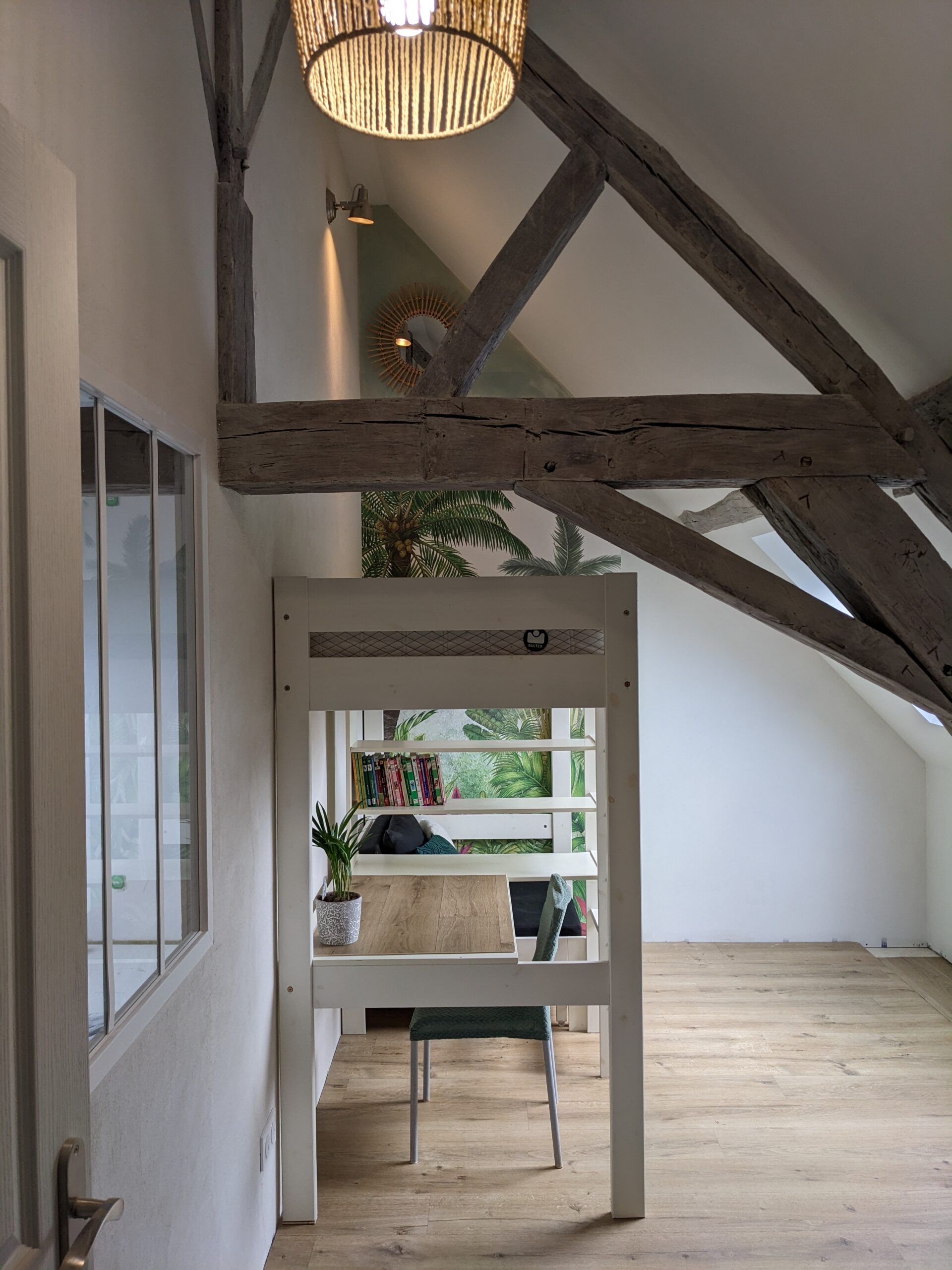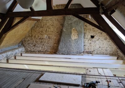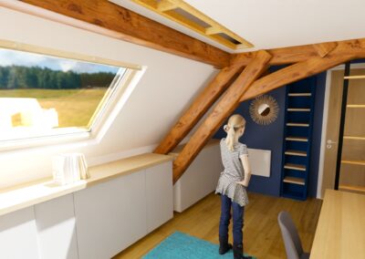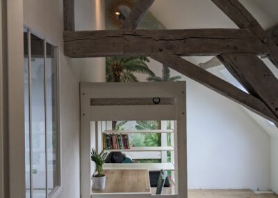 Il a été choisi de construire une structure mezzanine afin d’exploiter la hauteur de la pièce. Une échelle sur mesure permettra d’accéder au coin nuit en passant dans un espace de la ferme de la charpente. L’espace au sol est libéré, permettant également d’ajouter un espace bibliothèque sous la nouvelle structure.