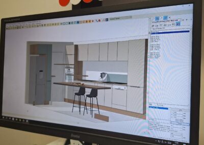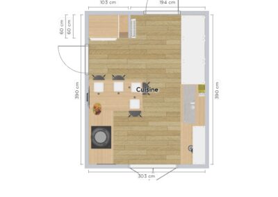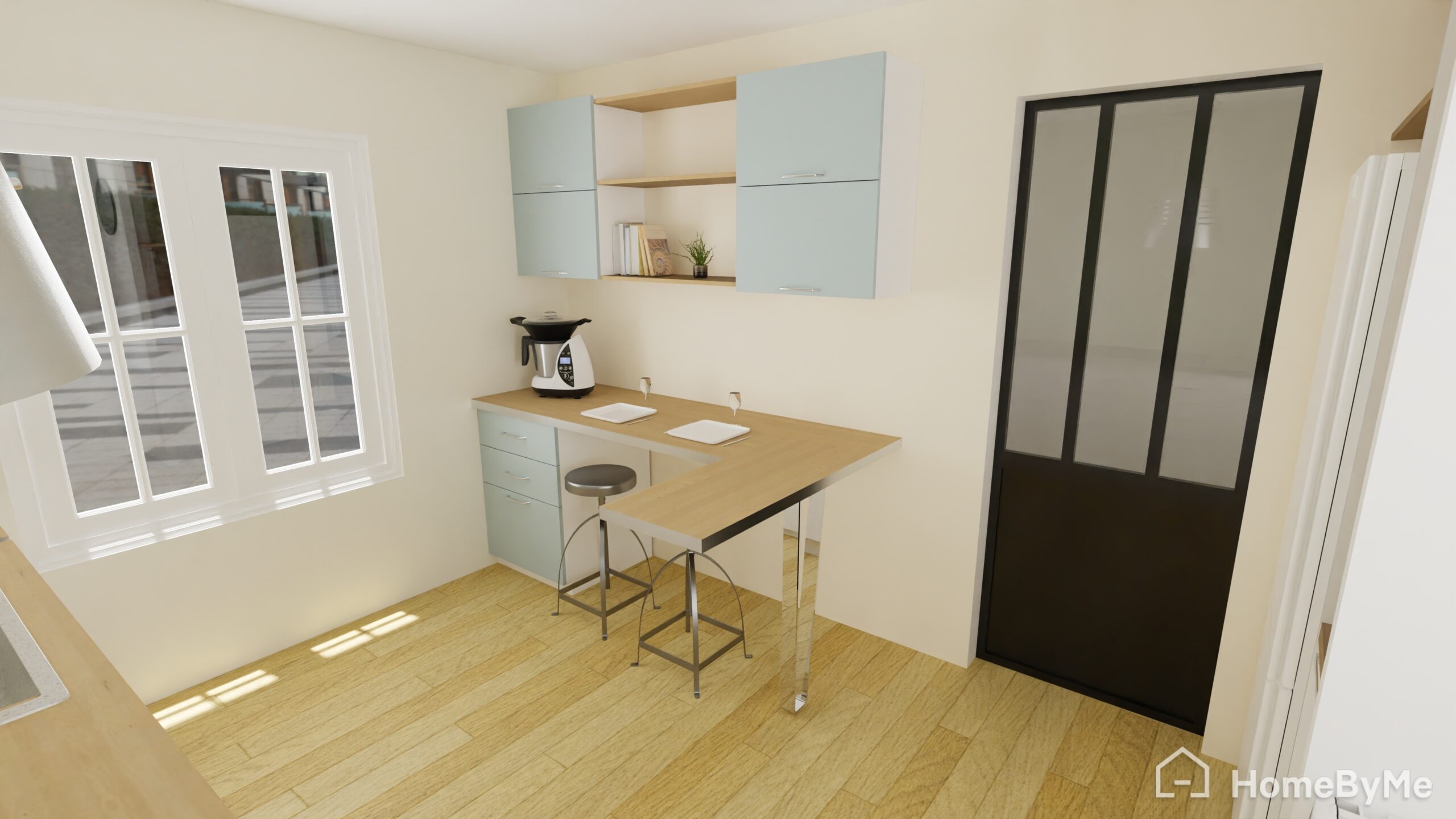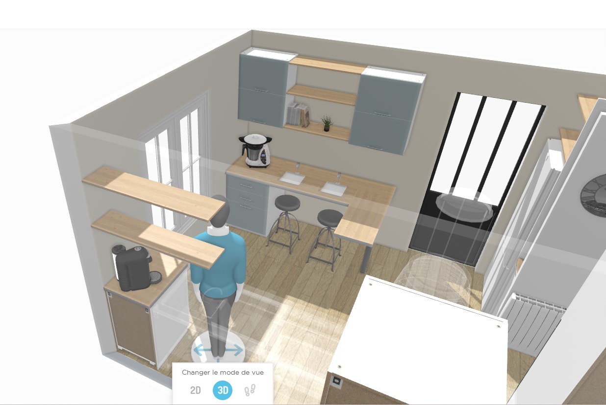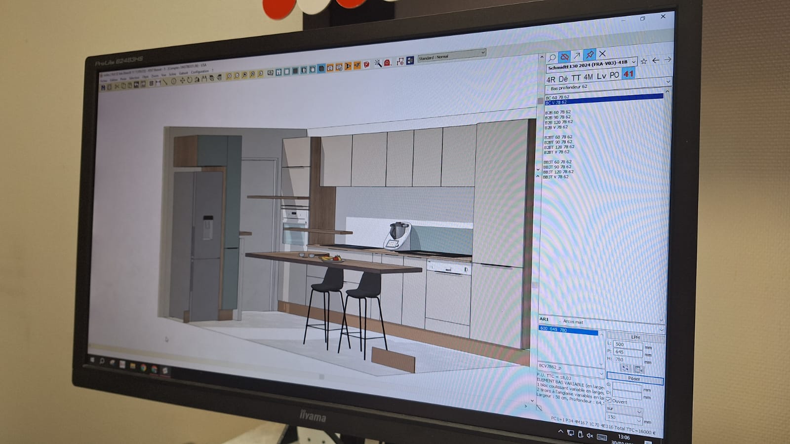Un plan d’aménagement a été proposé dans un premier temps, afin que les clients puissent se rendre chez leur cuisiniste avec cette proposition. Le plan et les aménagements proposés par le cuisiniste ont ensuite été ajustés pour répondre aux besoins et aux goûts des clients, au niveau des coloris et matériaux, pour les plan de travail,  les façades et les poignées. .
