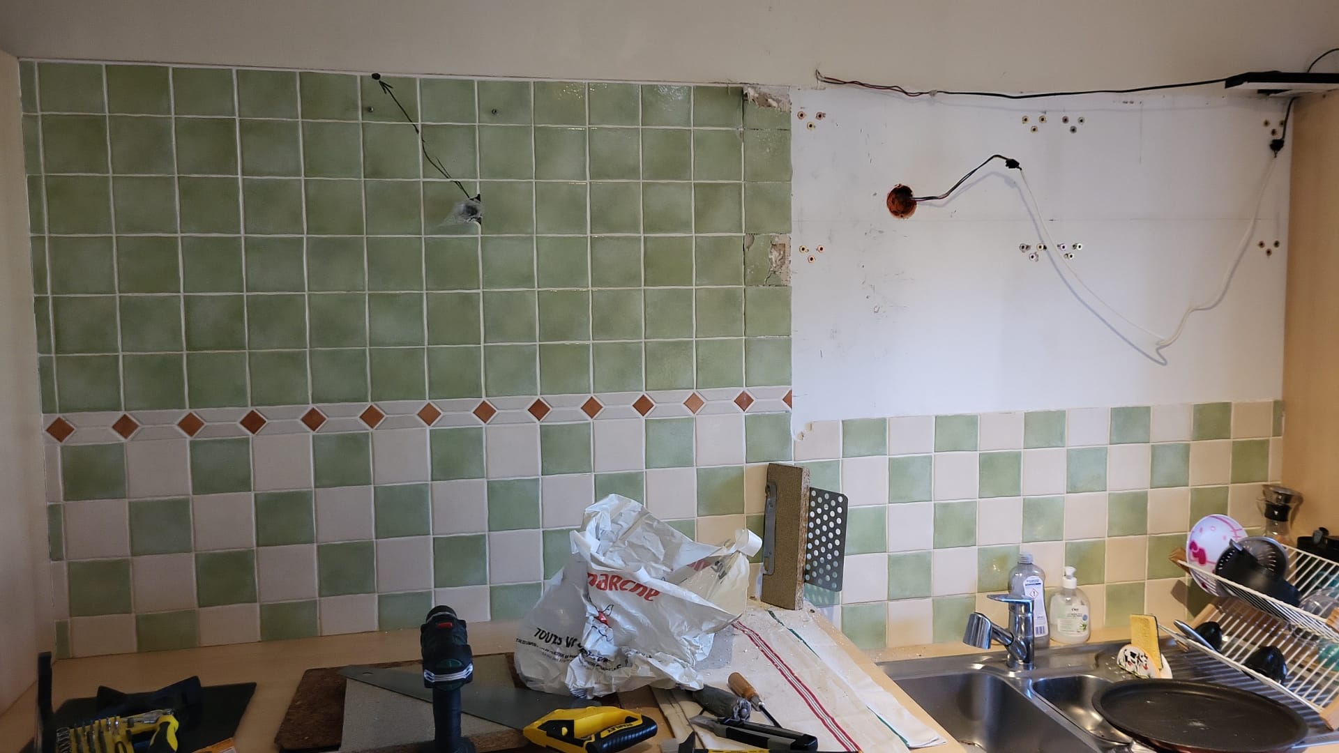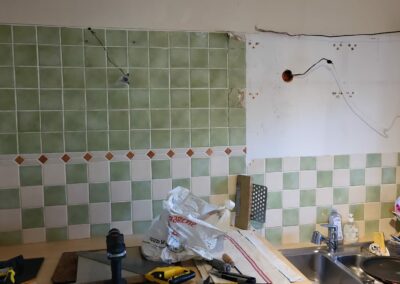 Après la dépose de la cuisine, les murs ont été rénovés, grâce au coaching travaux. Une mission shopping « matériaux et coloris » a permis de choisir les coloris pour les murs directement en magasin, avec des échantillons pour aider à la décision.