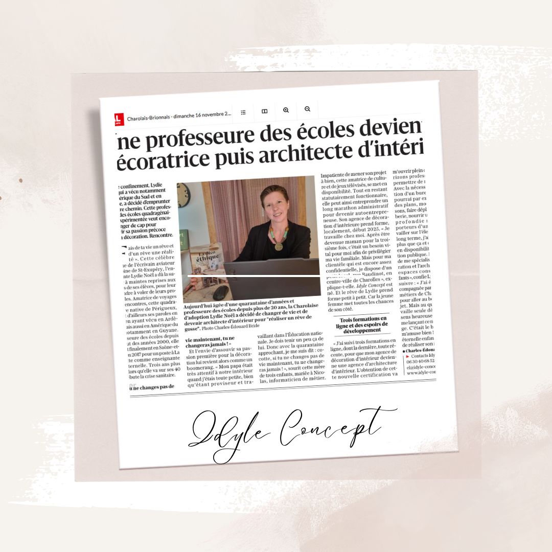 Je m’appelle Lydie Noël, je suis installée en tant qu’architecte d’intérieur et décoratrice à Charolles, à moins d’une heure de Mâcon et de Chalon sur Saône. Je vous accompagne dans vos projets dans le secteur du Charolais/Brionnais, dans des secteurs plus éloignés, et également à distance.